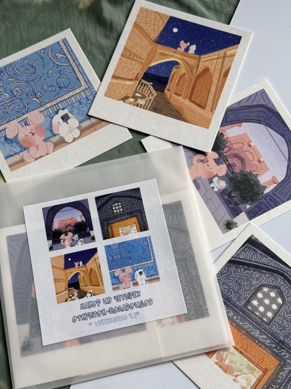 набор из 4х открыток полароидов в видами городов Узбекистанаоткрытки 10х11 см, на текстурной бумаге, обратная сторона белая